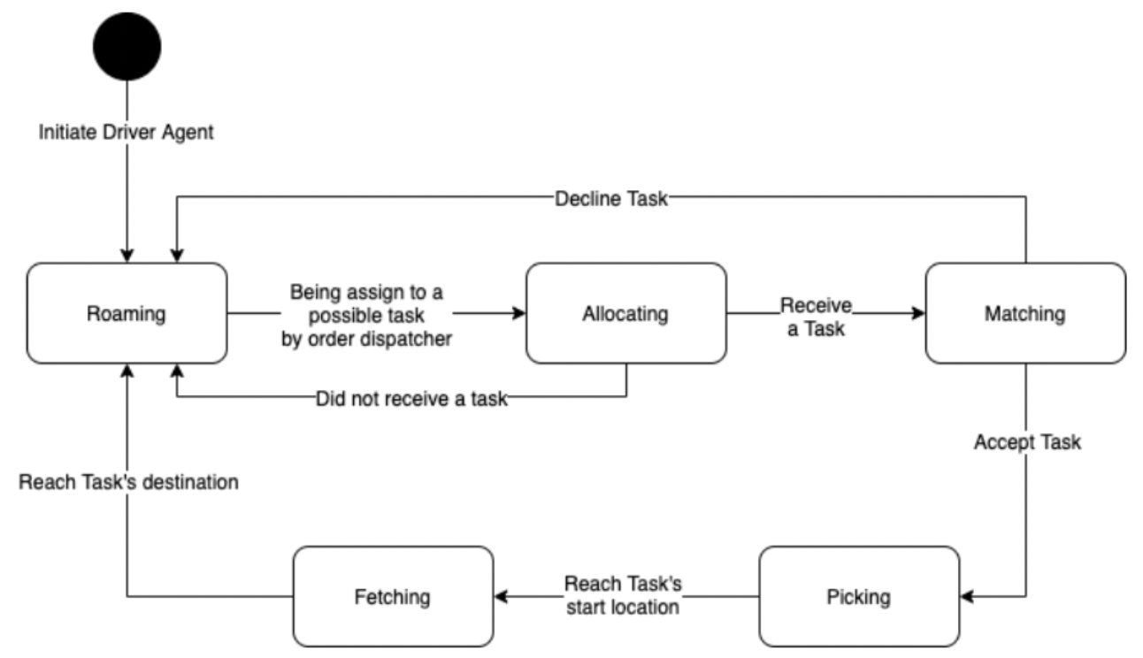 - If the driver did not receive a task by the centralized dispatcher, the state of the driver goes back to "Roaming". If the driver receive a task, the state of the driver change to "Matching"